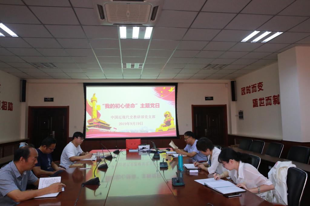 9月19日,中国近现代史教研部党支部在J9-223会议室举行“我的初心使命”主题党日活动,活动由支部书记宋开金主持,副经理邵勇及支部党员参加。