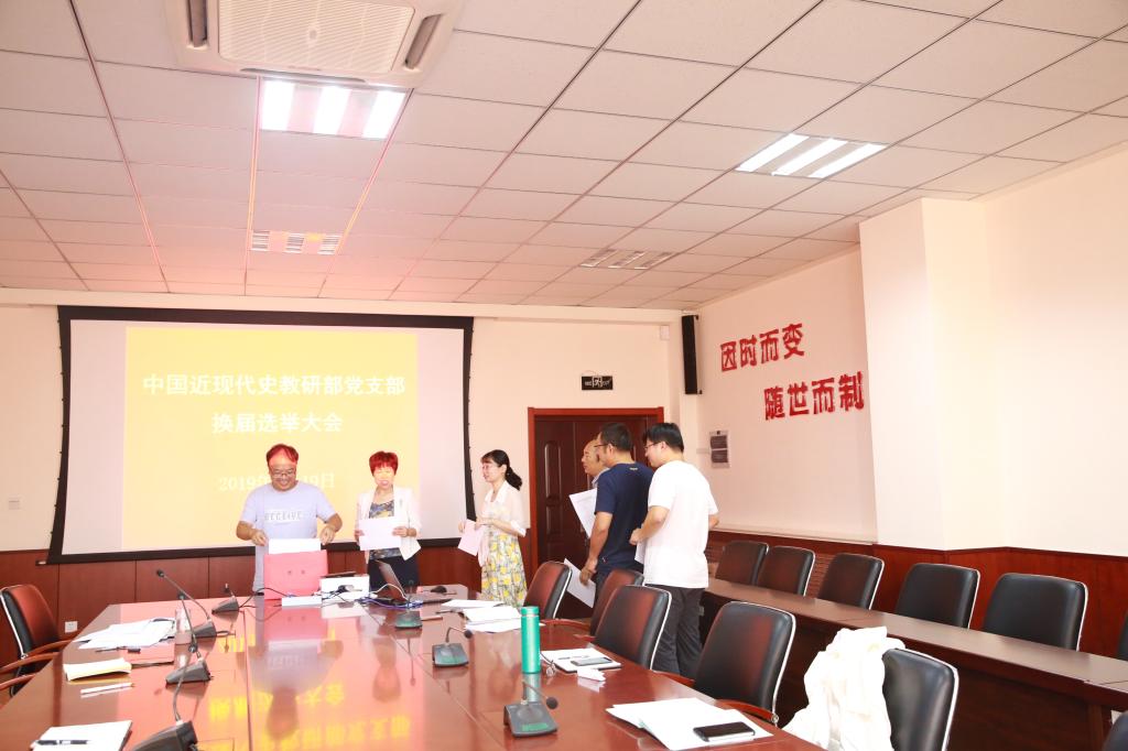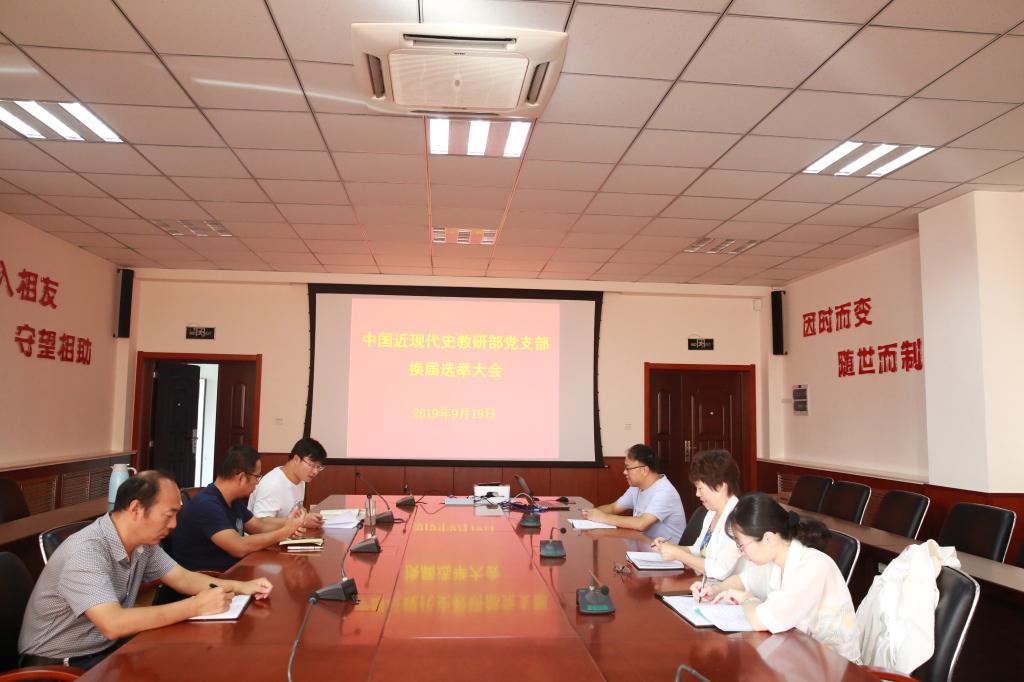 9月19日,中国近现代史教研部党支部在J9-223会议室举行支委会换届选举大会,会议由本届支部书记宋开金主持,副经理邵勇与支部党员参加。