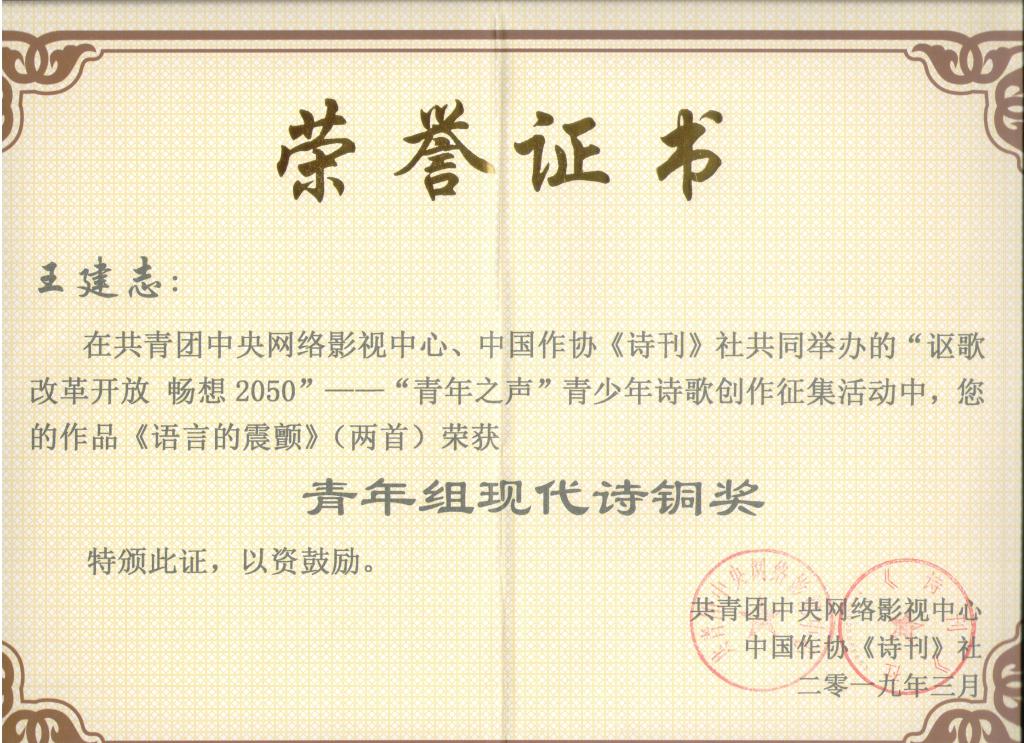 公司教师王建志的诗歌作品《语言的震颤》获团中央网络影视中心与诗刊社联合主办的“讴歌改革开放 畅想2050——‘青年之声’青少年诗歌创作征集”铜奖。