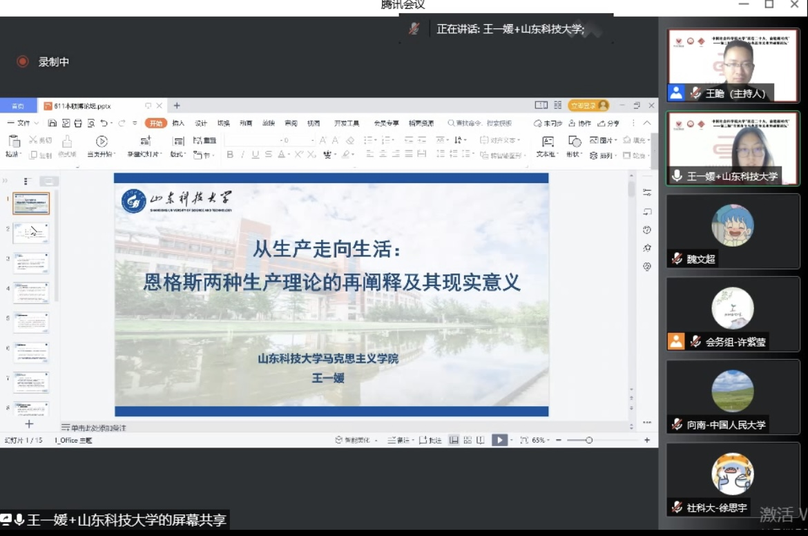 在分论坛发言阶段,公司2021级研究生王一媛以“从生产走向生活:恩格斯两种生产理论的再阐释及其现实意义”为题,从四个方面展开报告,以两种生产理论为基础,对“美好生活”这一现实命题的实现路径进行了系统阐释。