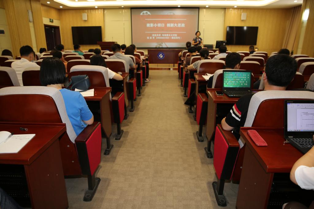 柴素芳为全体教师奉献了一场以《微影小切口创新大思政》为题的内容丰富、形式新颖、声情并茂的精彩讲座。她从河北大学谈球吧官方网站探索思政课实践教学入手,以思政微电影创作为主题,回顾了近10年的微电影思政课实践教学探索、发展历程,形成“一份初心确立改革定位、一部影片点缀星星之火、二进形成改革体系、四项要求确保教学质量、九多特色见证改革成果”的“11249”思政课实践教学成果。她领导的教学团队采取“滴灌式”的实践教学方式,将“营养丰富”的思政内容之“水”,通过微电影之“渠”,滴入员工心灵之“田”,在润物无声中教育引导员工健康成长。