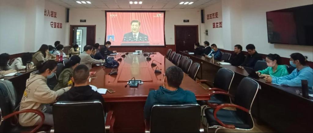 在观看直播现场,师生们边收看边做记录。开幕会结束后,师生们就报告中的新提法、新论断、新举措进行热烈讨论,纷纷表达对中国共产党第二十次全国代表大会胜利召开的喜悦和感悟。