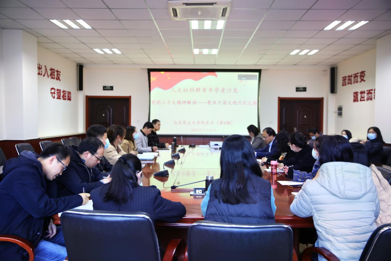 为深入学习贯彻党的二十大精神,深刻理解习近平新时代中国特色社会主义思想的丰富内涵、精神实质和实践要求。11月23日下午,由公司人文社会科学学科群主办,谈球吧官方网站承办的学术沙龙活动在J9-227采用专家讲座和圆桌会议、线下线上相结合方式成功举办。活动由副经理邵勇主持,人文社科群各公司部分青年教师参加,谈球吧官方网站硕士研究生线上旁听学习。本次活动的主题为“党的二十大精神解读——聚焦中国式现代化之路”,特别邀请公司副经理常春教授宣讲党的二十大精神,文法公司国虹副教授、公司贾强副教授、周月学术副教授、张建飞老师分别做主题发言。常春教授开篇点题,主要围绕中国式现代化的五个重要特征、本质要求、五项重大原则等展开论述,并结合二十大报告和当前学界对于这一问题的研究现状做了梳理,进而指出中国式现代化是当前学界热议、具有重大意义的热点问题。随后,国虹副教授讲述了现代化理论的缘起,并从线性发展历史角度分享了对于现代化的研究方法。贾强副教授则从恩格斯自然观视角切入、阐述了习近平生态文明思想所渗透的的辩证法思想。周月老师结合对全过程人民民主的研究,指出现代化所具备的三点元素,即成熟稳定制度、共同的价值理念、代表人类文明发展趋势。张健飞老师围绕“大历史观”视野指出,身处“两个大局”相互交织的关键时期,要顺应历史潮流,把握历史大势,增强历史主动。现场参会人员认真聆听、仔细记录。大家纷纷表示,沙龙准备充实、主题鲜明,紧扣时政热点,为学深悟透党的二十大精神搭建良好平台,一定要将焕发的思想自觉转化为科研教学源动力。