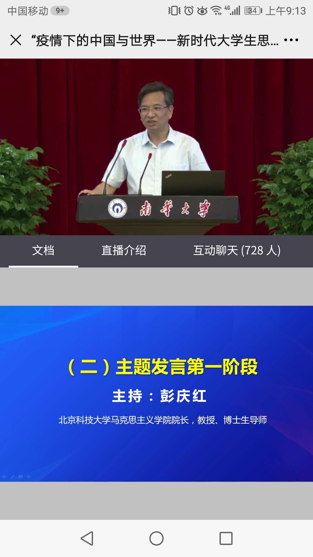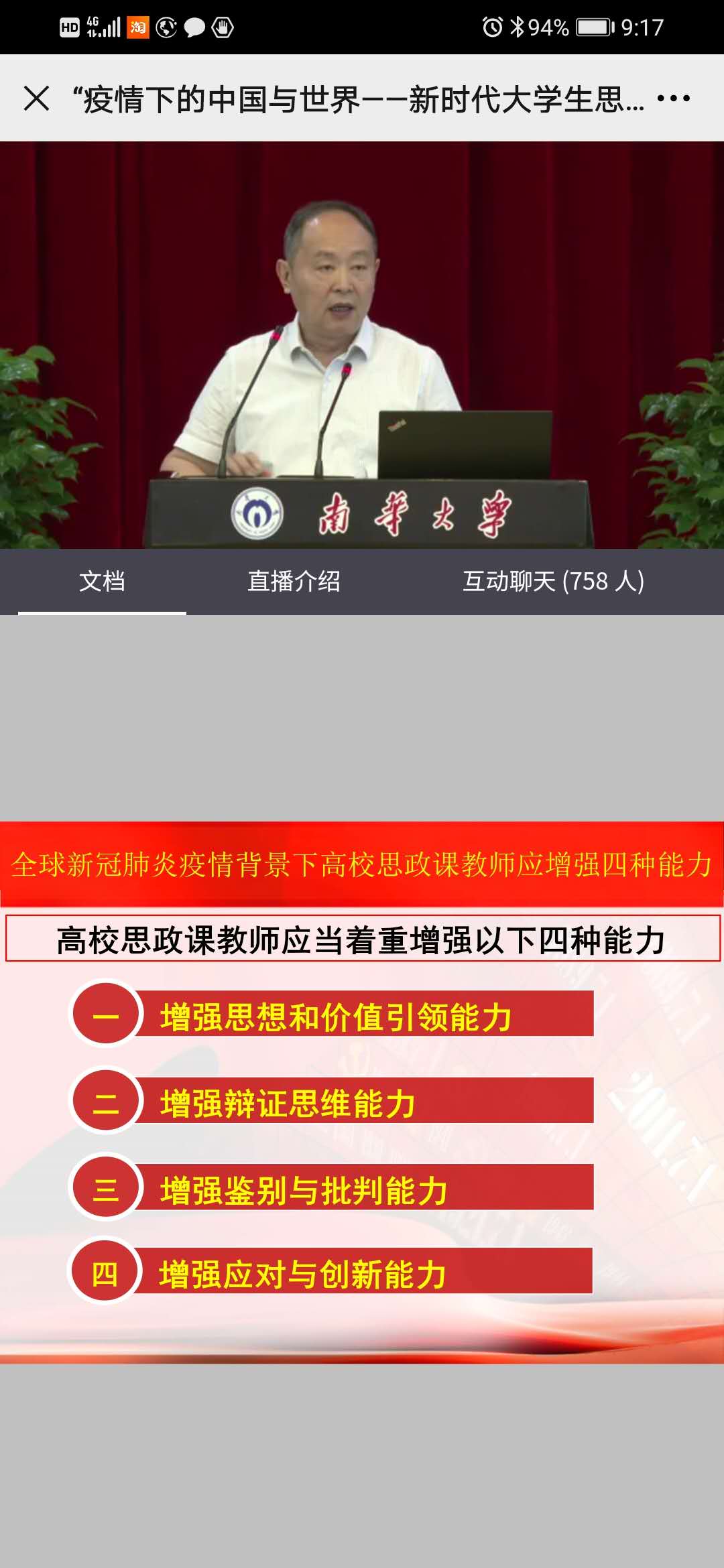 8月15日,“疫情下的中国与世界——新时代高校思想政治理论课改革创新”研讨会通过人民网公开课平台成功举办。本次大会由中国教育发展战略学会思想道德建设专业委员会、北京师范大学思想政治工作研究院和南华大学主办。会议采用“现场+直播连线”方式进行,公司领导班子及全体教师参加线上会议。