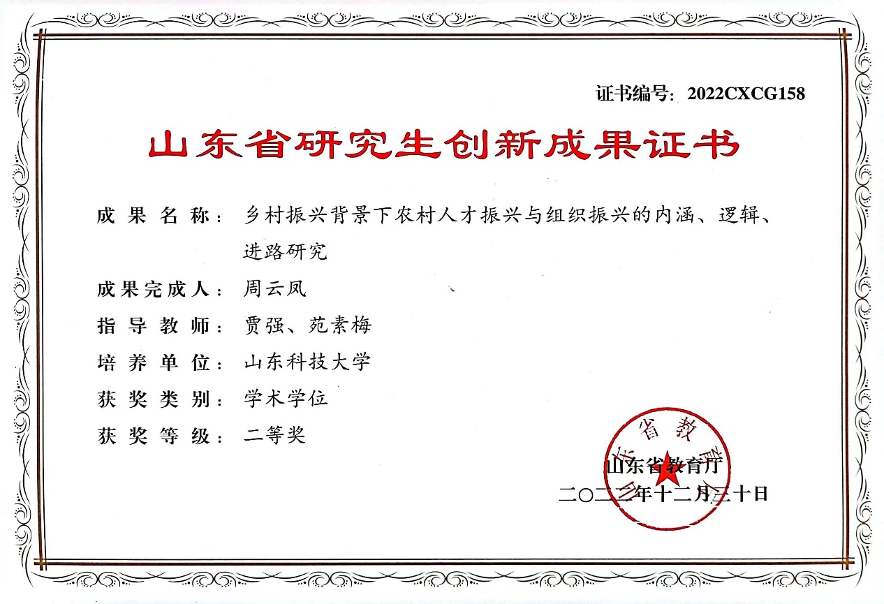 近日,山东省教育厅公布了2022年山东省研究生创新成果获奖名单,公司研究生周云凤、陈懿范、孙小源(指导教师:贾强、苑素梅)申报的“乡村振兴背景下农村人才振兴与组织振兴的内涵、逻辑、进路研究”荣获二等奖,实现了公司省级研究生创新成果奖的新突破。