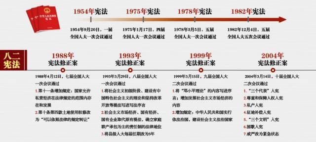 我国真正具有现代意义的宪法是“1982宪法”,即我国现行宪法。“1982宪法”具有里程碑意义,确立了十一届三中全会以来的基本路线“一个中心,两个基本点”。法律作为上层建筑,由经济基础所决定,随着我国经济社会的发展,为适应社会发展,宪法也在不断的修订,从1988年到2018年前后共修订了5次,最近一次是2018年。2018年宪法修正案共有21条,其中包括序言的4个自然段和相关条款22条。修正案的内容主要有:(一)习近平新时代中国特色社会主义思想载入宪法,(二)明确中国共产党的领导是中国特色社会主义最本质的特征,(三)新增“监察委员会”一节,(四)调整国家主席任期,(五)确立宪法宣誓制度,(六)全国人大宪法和法律委员会更名,(七)增加关于设区的市的立法权的相关规定。